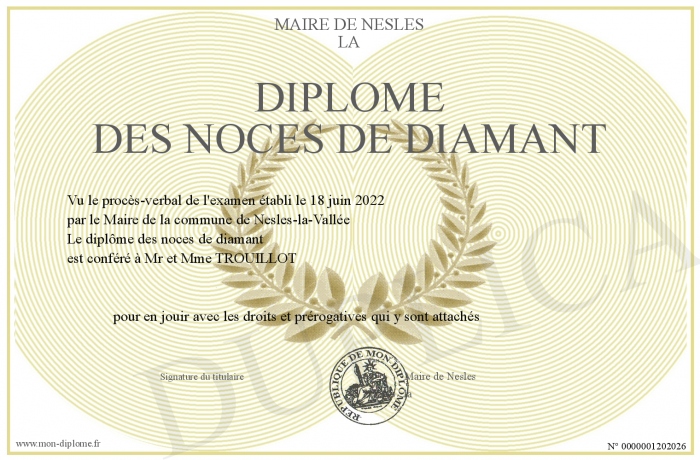 Envoyez par email votre Diplôme des noces de diamant personalisé