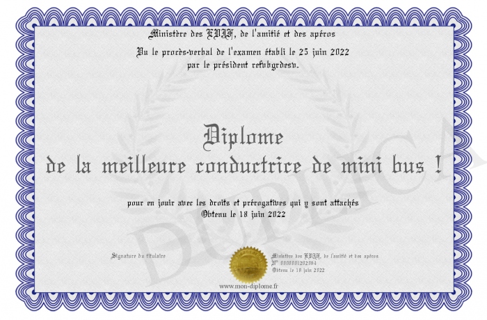 Envoyez par email votre Diplôme de la meilleure conductrice de mini bus ! personalisé