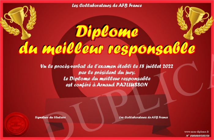 Envoyez par email votre Diplôme du meilleur responsable personalisé