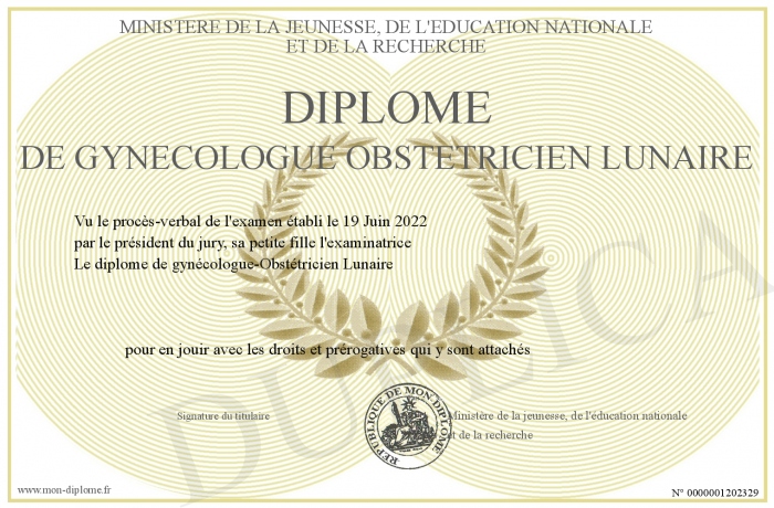 Envoyez par email votre Diplôme de gynécologue Obstétricien Lunaire personalisé