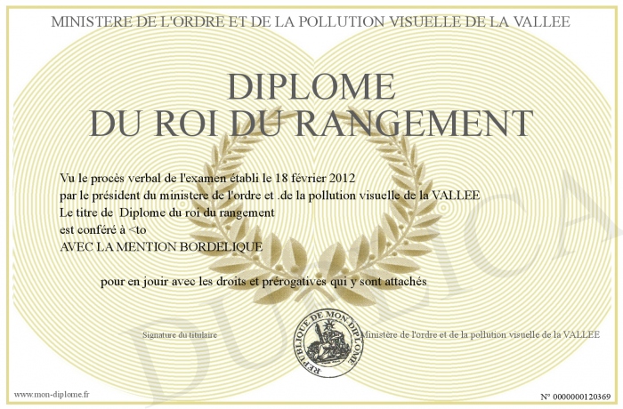 Envoyez par email votre Diplôme du roi du rangement personalisé