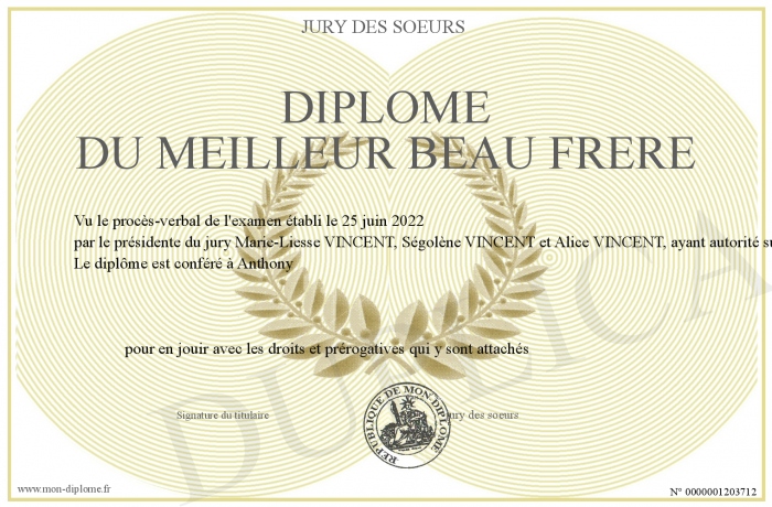 Envoyez par email votre Diplôme du meilleur beau frère personalisé