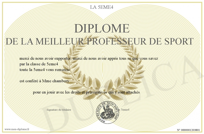 Envoyez par email votre Diplôme de la meilleur professeur de sport personalisé
