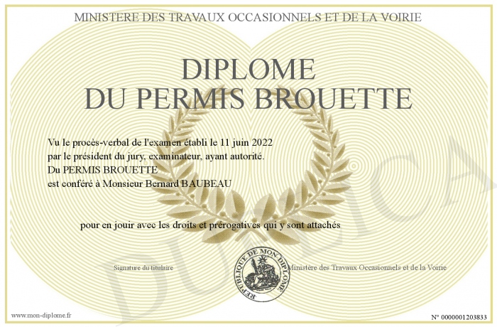 Envoyez par email votre Diplôme du PERMIS BROUETTE personalisé