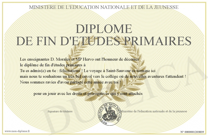 Envoyez par email votre Diplôme de fin d'études primaires personalisé