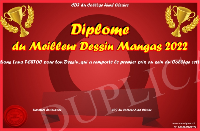 Envoyez par email votre Diplôme du Meilleur Dessin Mangas 2022 personalisé