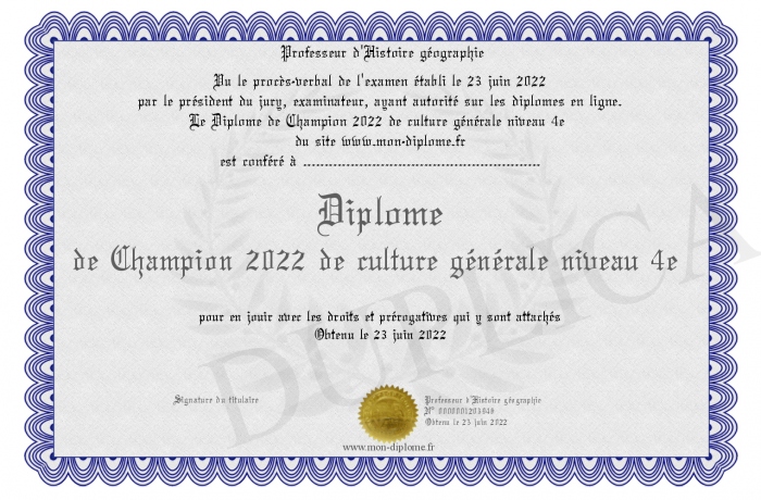 Envoyez par email votre Diplôme de Champion 2022 de culture générale niveau 4e personalisé
