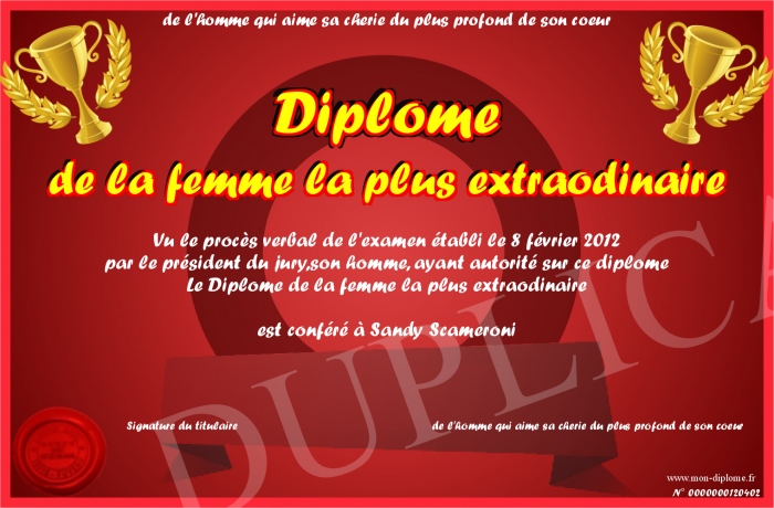 Envoyez par email votre Diplôme de la femme la plus extraodinaire personalisé