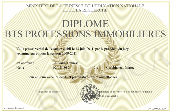 Envoyez par email votre Diplome BTS Professions immobilières personalisé