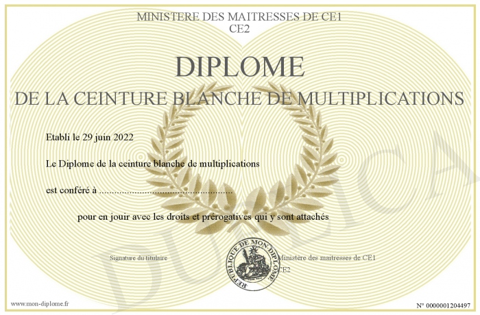 Envoyez par email votre Diplôme de la ceinture blanche de multiplications personalisé