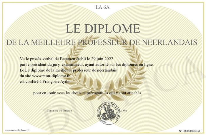 Envoyez par email votre Le diplôme de la meilleure professeur de néerlandais personalisé