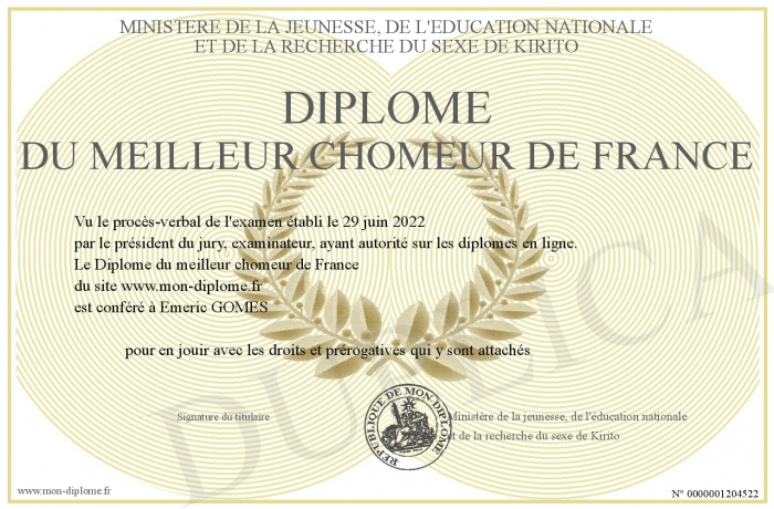 Envoyez par email votre Diplôme du meilleur chômeur de France personalisé