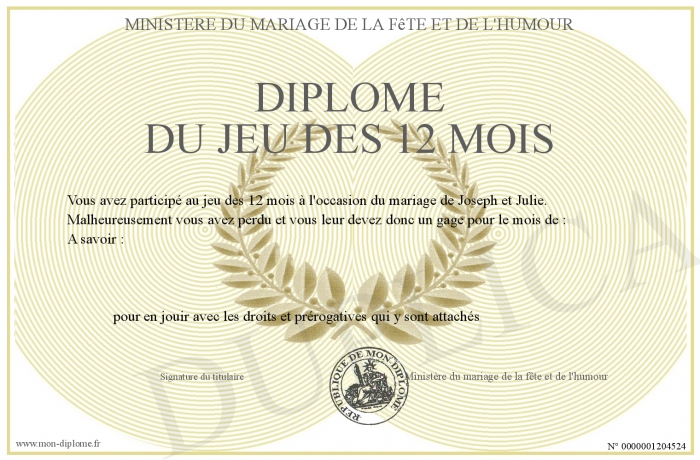 Envoyez par email votre Diplôme du jeu des 12 mois personalisé
