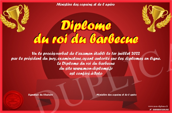Envoyez par email votre Diplôme du roi du barbecue personalisé