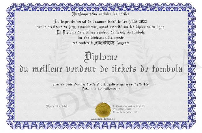 Envoyez par email votre Diplôme du meilleur vendeur de tickets de tombola personalisé