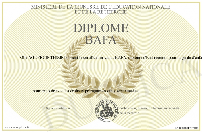 Envoyez par email votre Diplôme BAFA personalisé