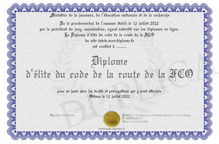 Envoyez par email votre Diplôme d'élite du code de la route de la FCO personalisé
