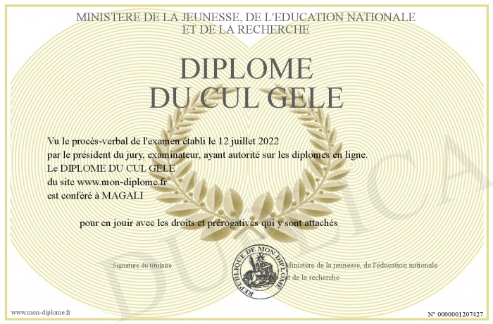 Envoyez par email votre DIPLOME DU CUL GELE personalisé