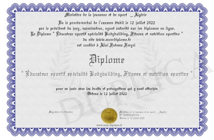 Envoyez par email votre Diplôme - Éducateur sportif spécialité Bodybuilding, Fitness et nutrition sportive - personalisé