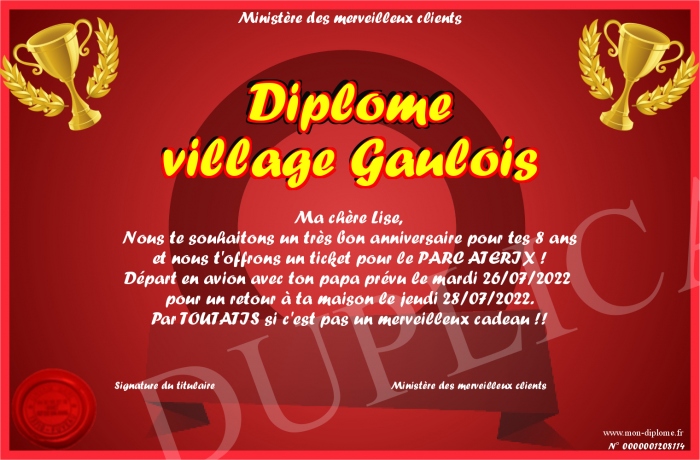 Envoyez par email votre Diplôme village Gaulois personalisé