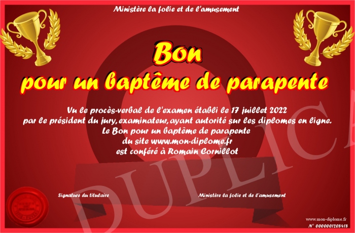 Envoyez par email votre Bon pour un baptême de parapente personalisé