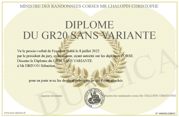 Envoyez par email votre Diplôme du GR20 SANS VARIANTE personalisé