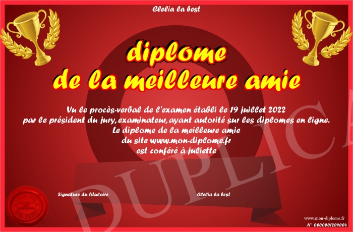 Envoyez par email votre diplome de la meilleure amie personalisé
