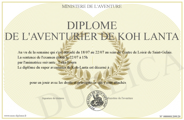 Envoyez par email votre Diplôme de l'aventurier de Koh Lanta personalisé