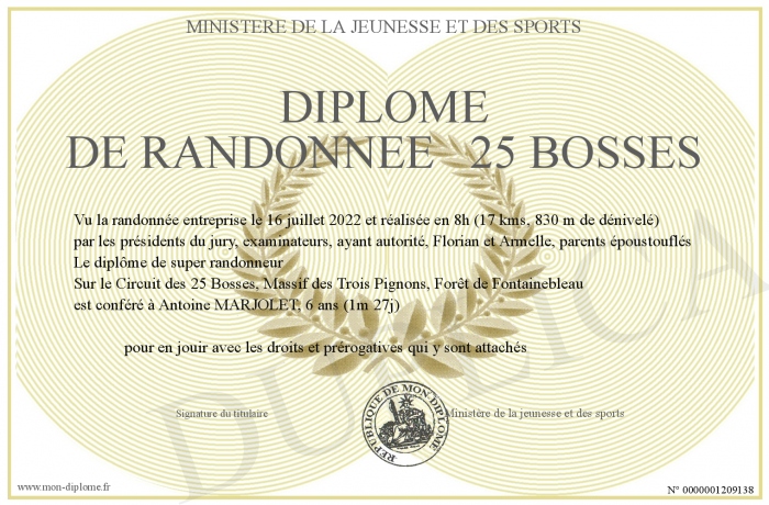 Envoyez par email votre Diplôme de Randonnée 25 Bosses personalisé