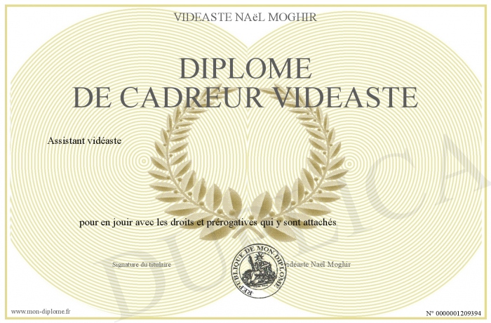 Envoyez par email votre Diplôme de cadreur vidéaste personalisé