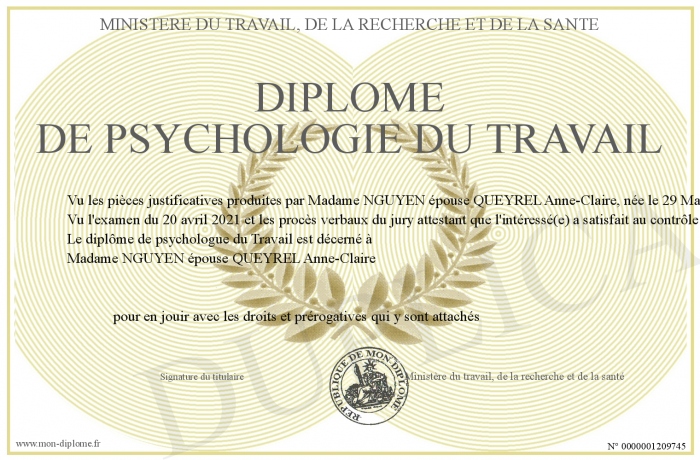 Envoyez par email votre Diplôme de psychologie du travail personalisé