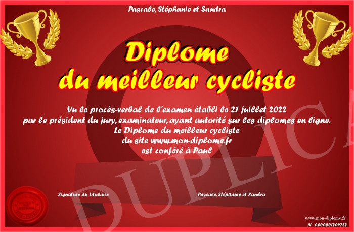 Envoyez par email votre Diplôme du meilleur cycliste personalisé