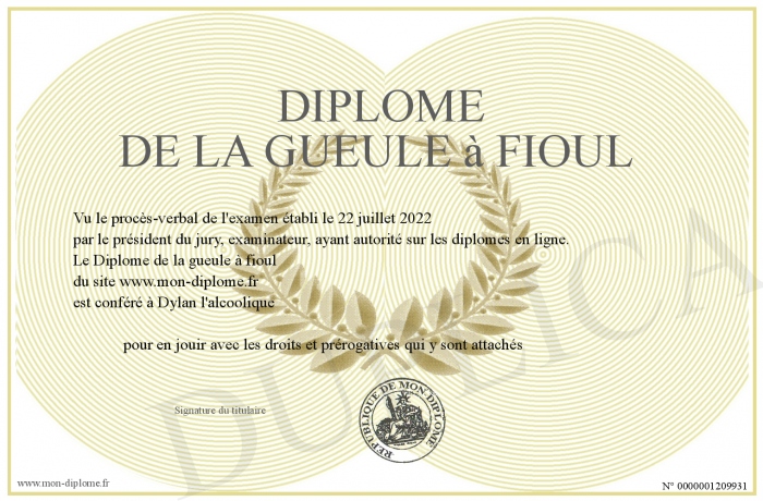 Envoyez par email votre Diplôme de la gueule à fioul personalisé