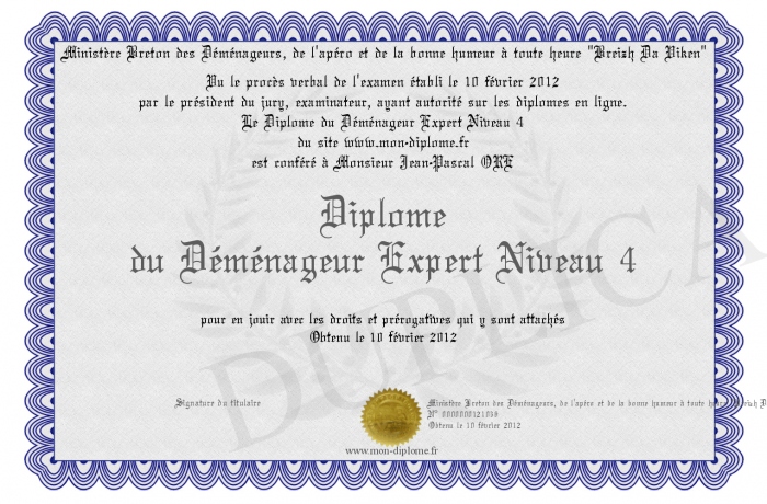 Envoyez par email votre Diplôme du Déménageur Expert Niveau 4 personalisé