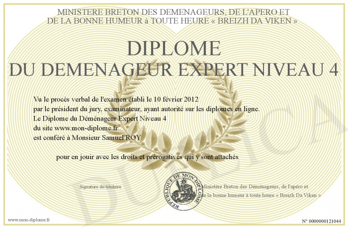Envoyez par email votre Diplôme du Déménageur Expert Niveau 4 personalisé