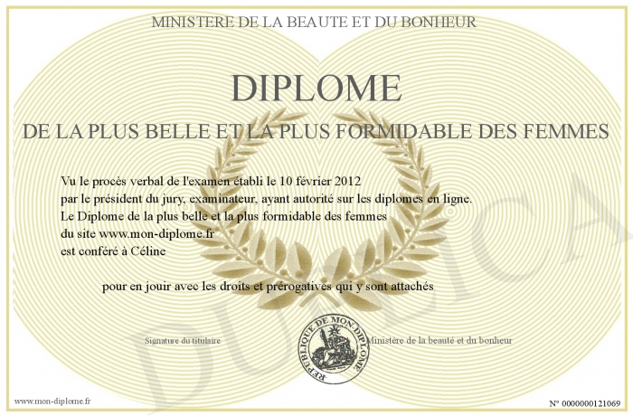 Envoyez par email votre Diplôme de la plus belle et la plus formidable des femmes personalisé