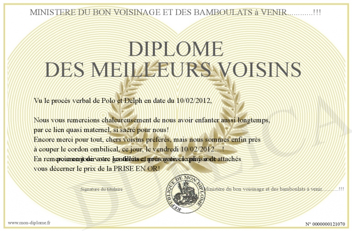 Envoyez par email votre Diplôme des meilleurs voisins personalisé