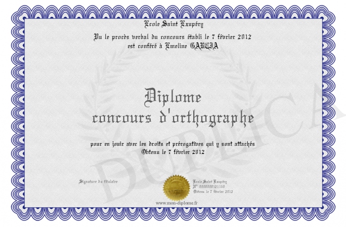Envoyez par email votre Diplôme concours d'orthographe personalisé