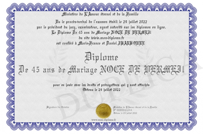 Envoyez par email votre Diplôme De 45 ans de Mariage NOCE DE VERMEIl personalisé