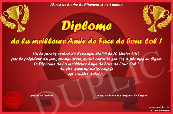 Envoyez par email votre Diplome de la meilleure Amie de Face de bouc lol ! personalisé