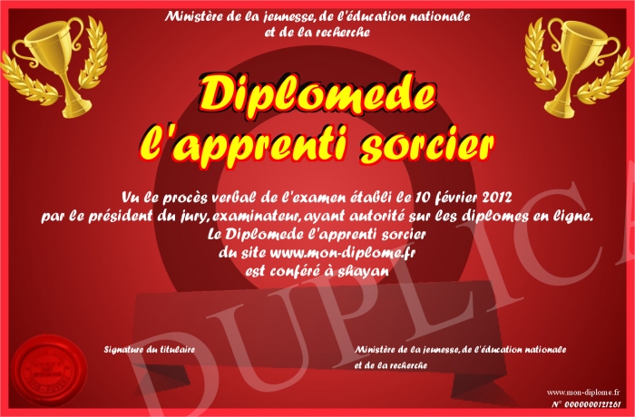 Envoyez par email votre Diplômede l'apprenti sorcier personalisé