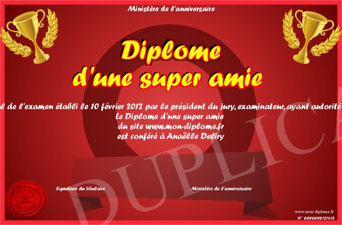 Envoyez par email votre Diplôme d'une super amie personalisé