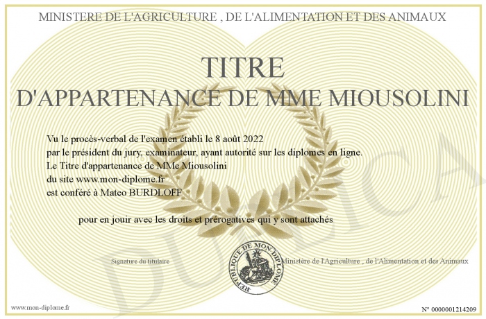 Envoyez par email votre Titre d'appartenance de MMe Miousolini personalisé