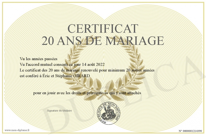 Envoyez par email votre CERTIFICAT 20 ANS DE MARIAGE personalisé