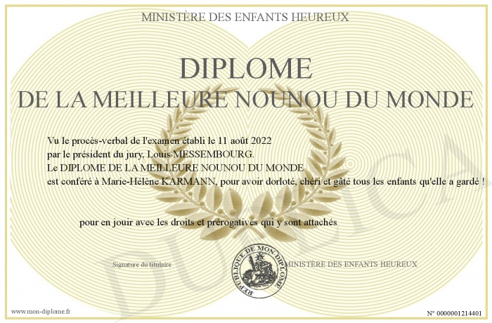 Envoyez par email votre DIPLOME DE LA MEILLEURE NOUNOU DU MONDE personalisé