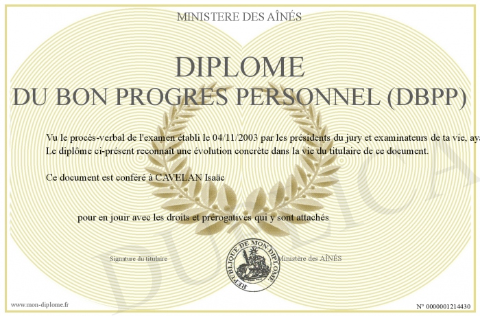Envoyez par email votre Diplôme Du Bon Progrès Personnel (DBPP) personalisé