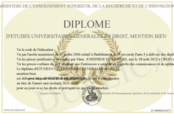 Envoyez par email votre Diplôme d'études universitaires générales en DROIT, mention bien personalisé