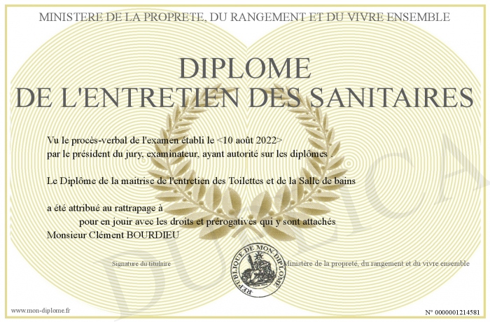 Envoyez par email votre Diplôme de l'entretien des sanitaires personalisé