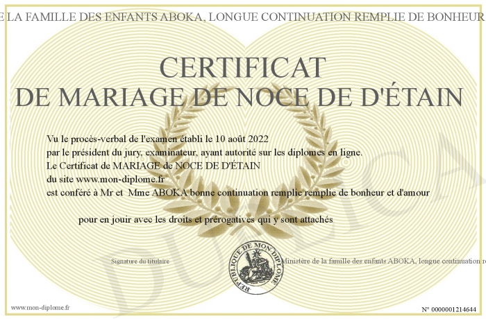 Envoyez par email votre Certificat de MARIAGE de NOCE DE D'ÉTAIN personalisé