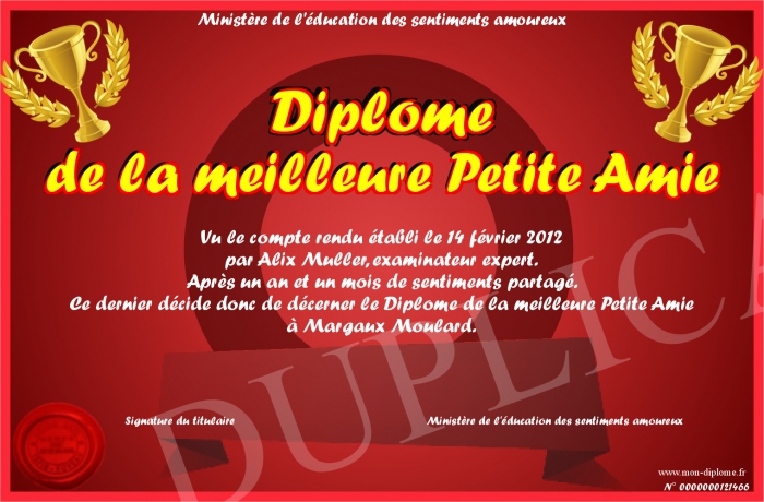 Envoyez par email votre Diplome de la meilleure Petite Amie personalisé